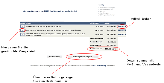 So können Sie über unsere Internetseite bestellen. Der Einkauf über unsere Internetseiten unterscheidet sich nicht allzu sehr vom Einkaufen im Supermarkt. Solange Sie auf unseren Seiten stöbern, steht Ihnen ein virtueller Warenkorb zur Verfügung, vergleichbar mit dem Einkaufswagen im Supermarkt. Alles was Sie gerne einkaufen möchten, legen Sie einfach durch Klicken auf den Bestellbutton
